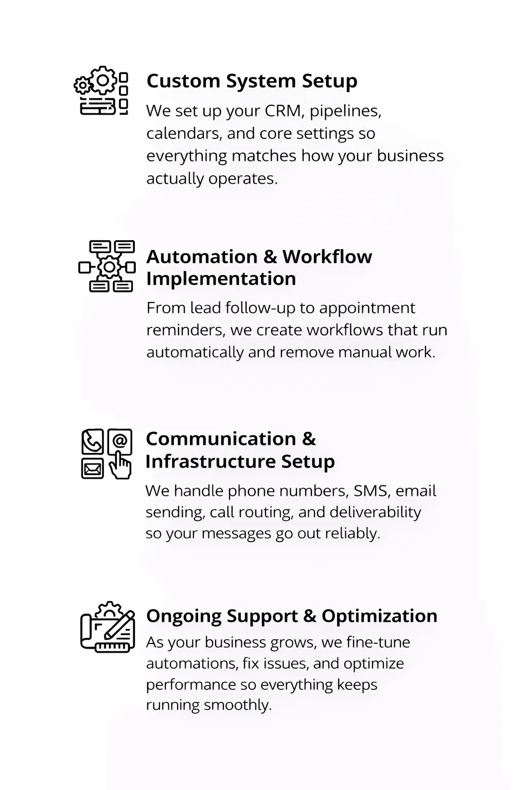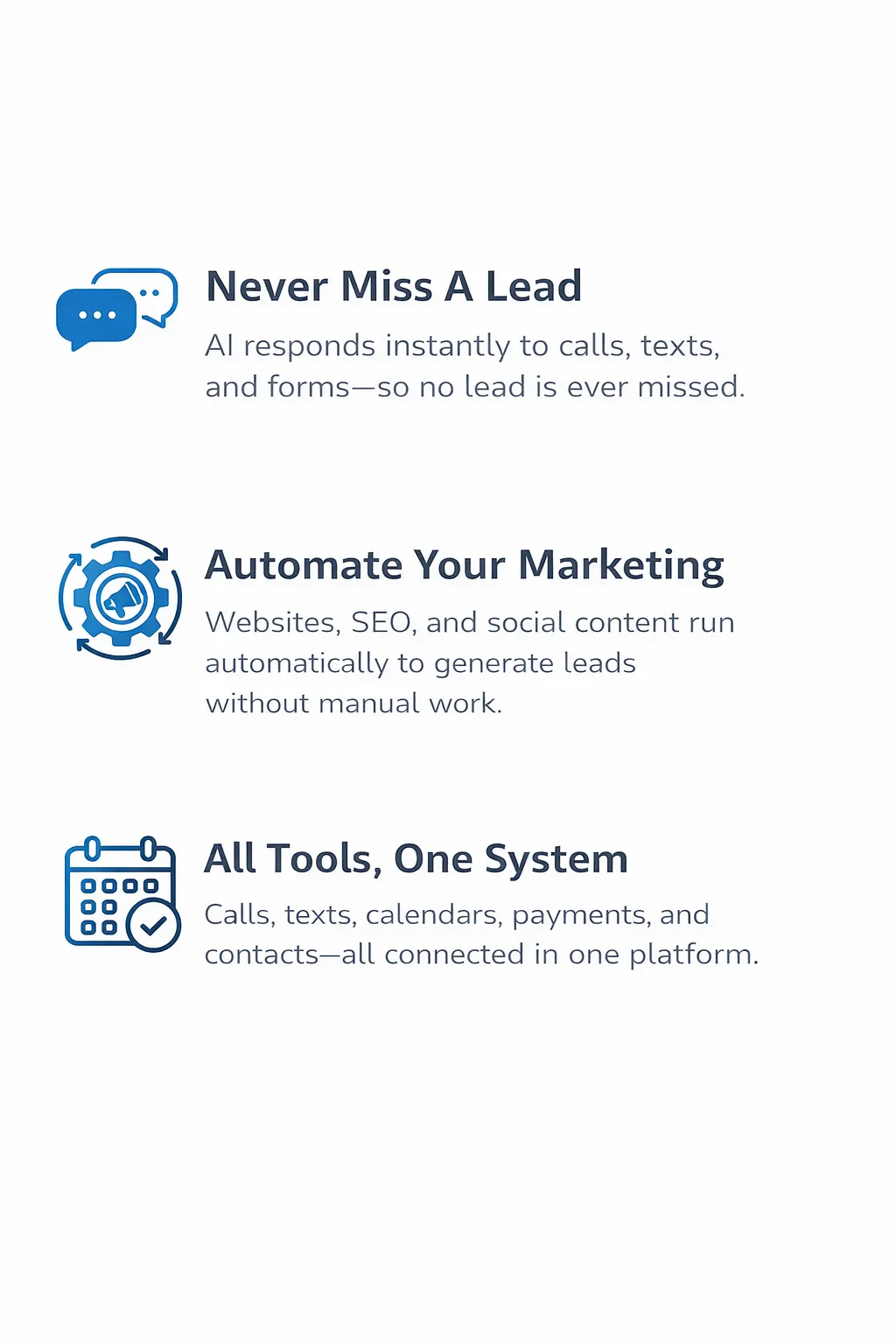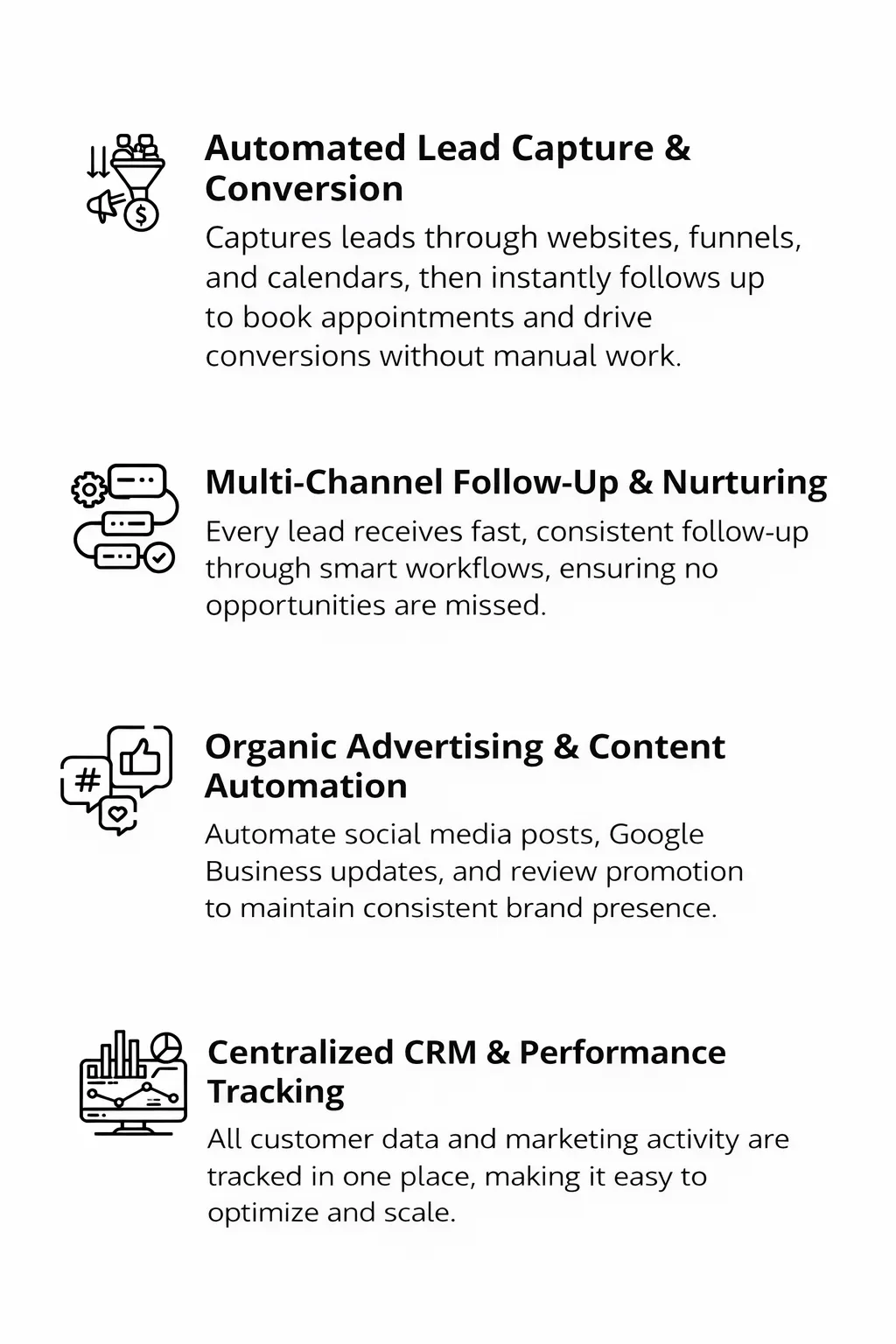Websites, SEO, and social posts are created and optimized automatically to drive consistent lead generation without manual work.